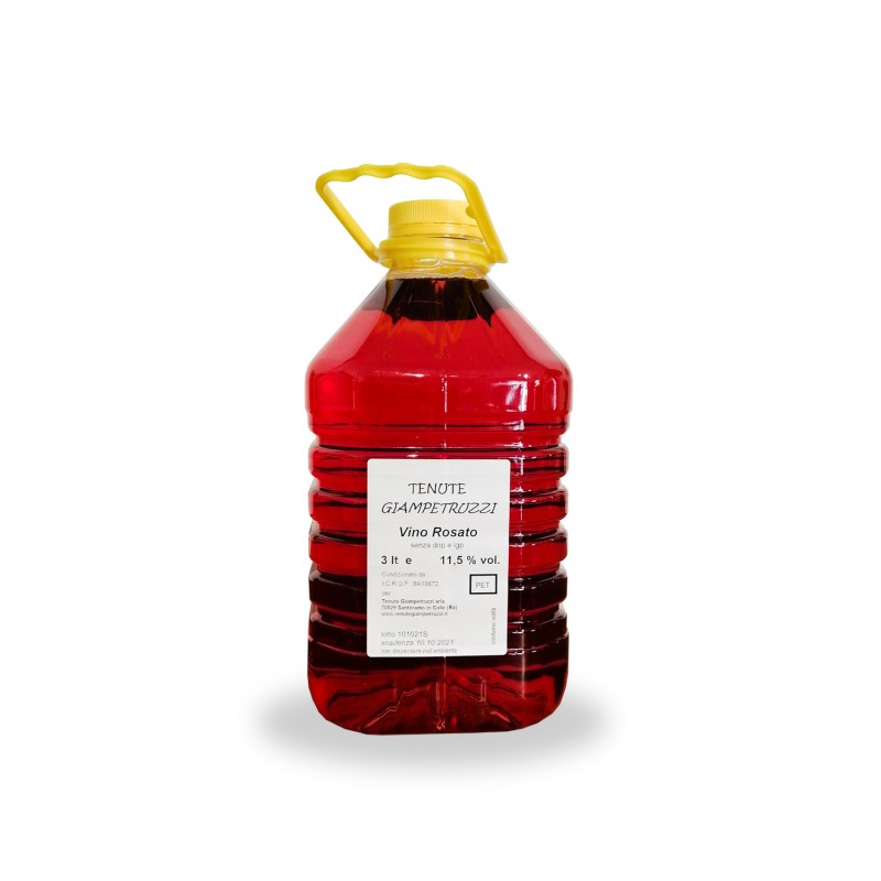 Vino sfuso rosato 3L. Prodotto da un blend di uve: primitivo, bombino nero, nero di troia. Coltivato in Agro di Acquaviva delle Fonti su terreno carsico. Allevato a spalliera in coltivazioni convenzionali. Un vino da tavola di qualità, si presenta di color rosa tenue. Dallo spiccato gusto fresco e minerale.